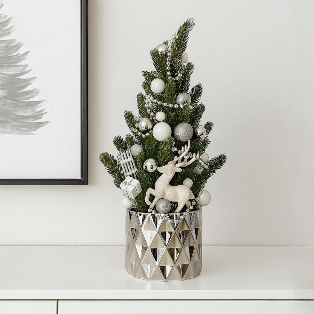 Nowoczesna, efektowna świąteczna dekoracja w formie mini-choinki osadzonej w eleganckiej, geometrycznej donicy o lustrzanym połysku. Kompozycja została wykonana z gęstych, wysokiej jakości gałązek świerkowych i ozdobiona bombkami w odcieniach srebra, bieli i perły, które nadają jej luksusowego charakteru.