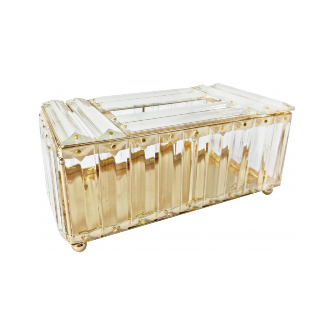 Elegancki chustecznik wykonany z kryształów. Dno pojemnika jest metalowe, zakończone czterema podnóżkami okrągłymi.