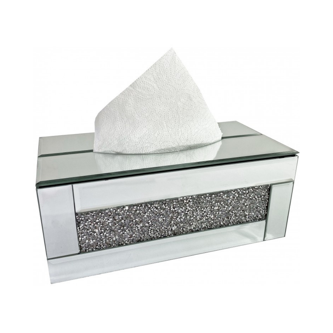 Elegancki chustecznik wykonany z kryształów. Dno pojemnika jest plastikowe, a środek welurowy.