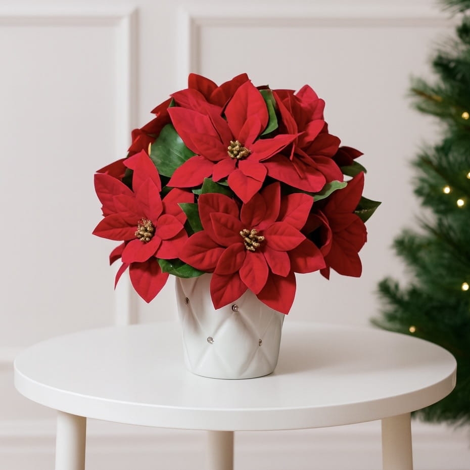 Klasyczna i elegancka dekoracja świąteczna w formie gwiazdy betlejemskiej w intensywnym, głębokim odcieniu czerwieni. Kwiaty osadzone są w stylowej białej doniczce zdobionej subtelnymi kryształkami, które dodają kompozycji blasku i wyjątkowego uroku.