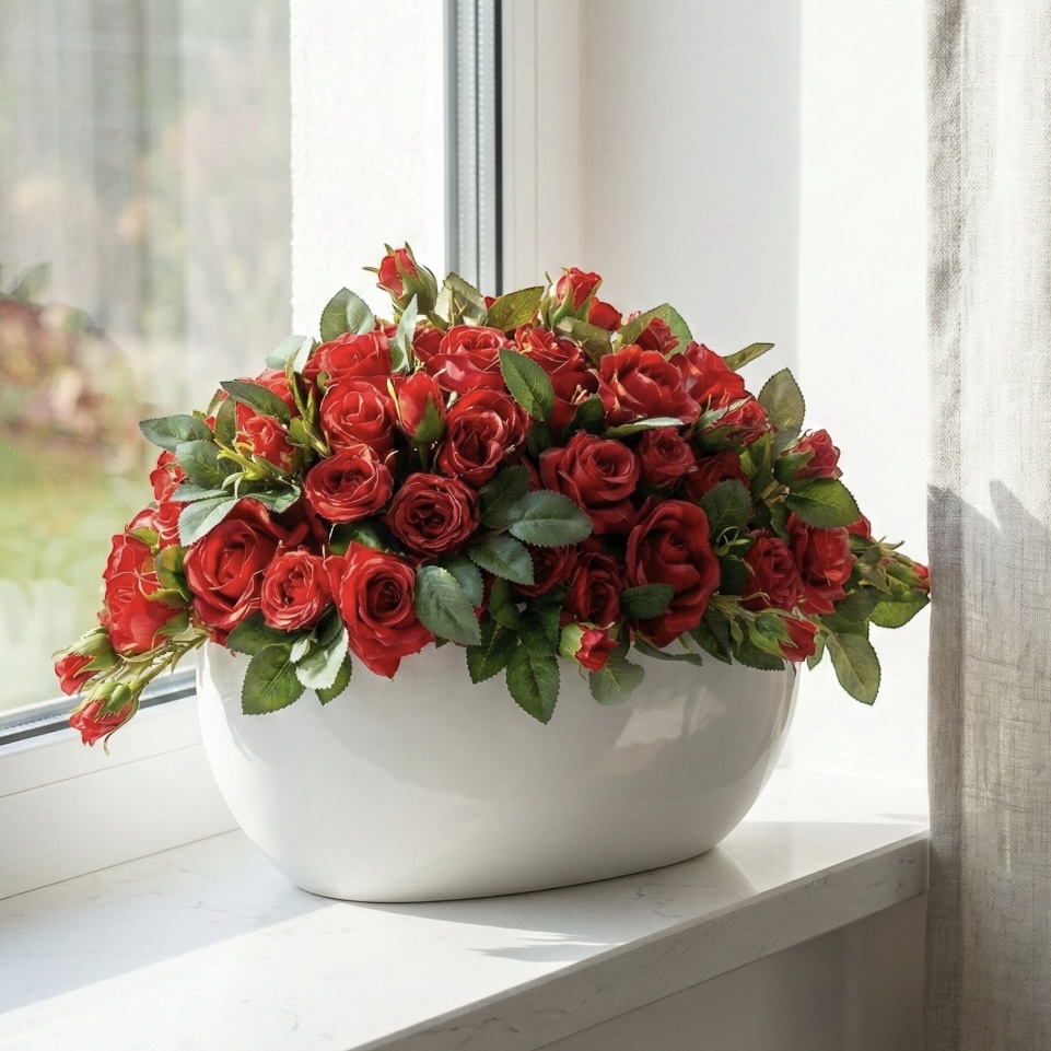 Elegancka i wyrazista dekoracja z intensywnie czerwonych róż, osadzona w nowoczesnej, białej doniczce. Pełna, gęsta forma przyciąga spojrzenia i nadaje wnętrzu wyjątkowego charakteru. Idealna na komodę, parapet lub stół piękna przez cały rok, bez konieczności pielęgnacji.