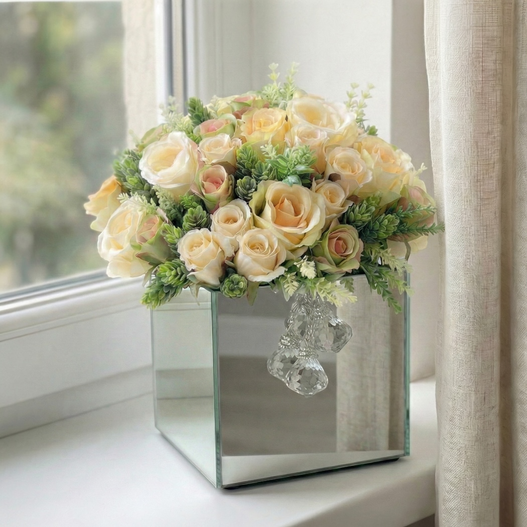 Kompozycja kwiatowa z delikatnych, kremowo-brzoskwiniowych róż w eleganckiej, lustrzanej doniczce. Subtelna kolorystyka w połączeniu z zielonymi dodatkami tworzy harmonijną, świeżą dekorację idealną na stół, komodę lub parapet. Całość dopełniają ozdobne kryształki, które dodają aranżacji lekkości i elegancji.