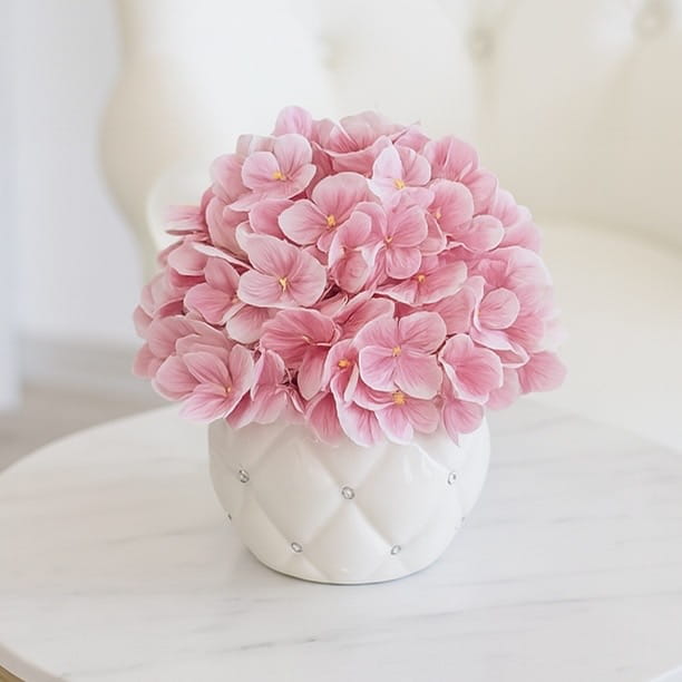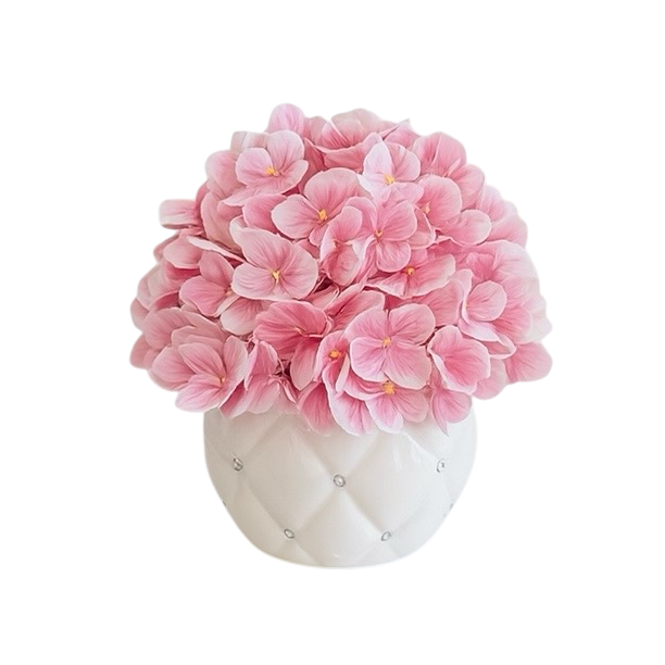Nasza wyjątkowa kompozycja kwiatowa to esencja piękna i staranności wykonania. Wykonana z wysokiej jakości kwiatów hortensji, które są wspaniale oddane w materiale silikonowym o delikatnym odcieniu różu. Całość tego arcydzieła została starannie umieszczona w ceramicznej doniczce, której powierzchnię zdobią ozdobne cyrkonie, nadając kompozycji subtelny blask.