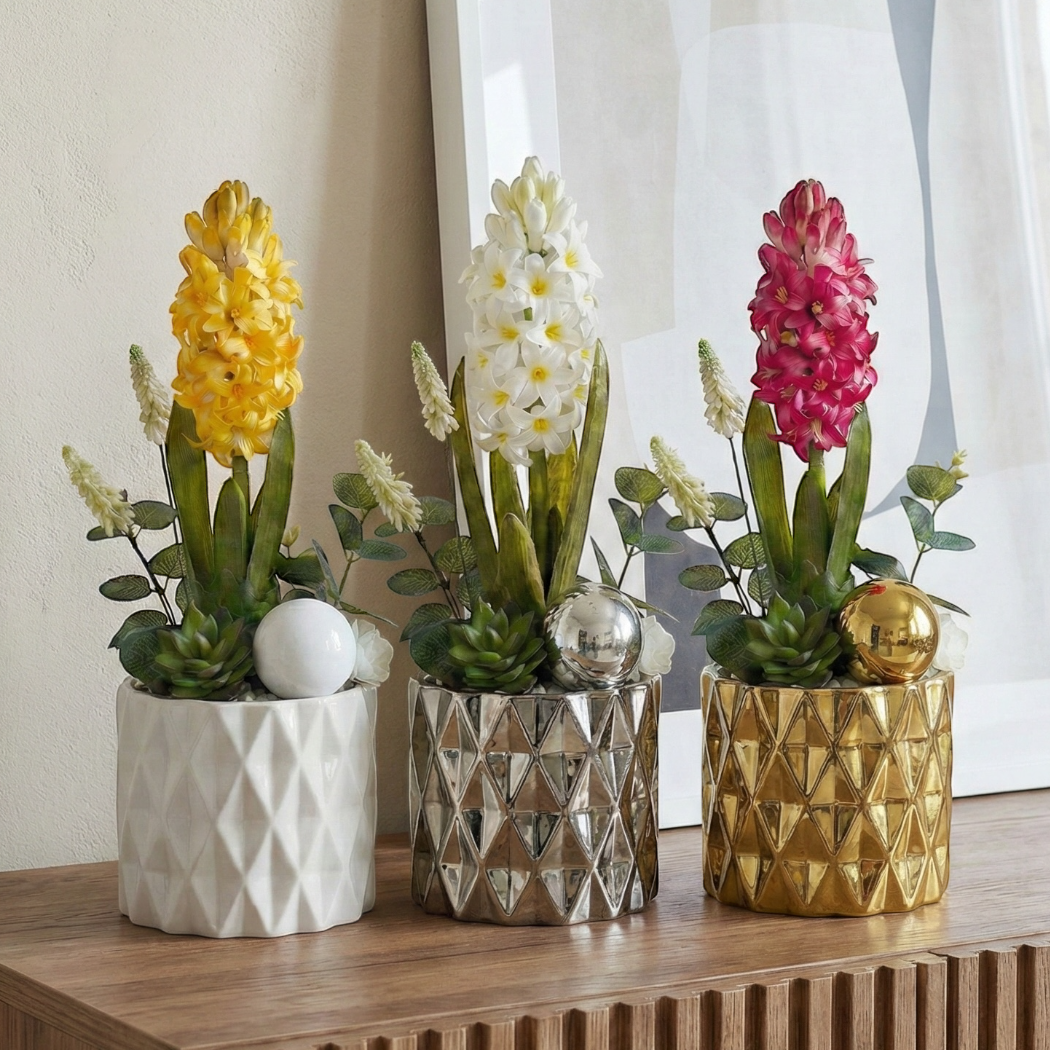 Elegancka, wiosenna kompozycja z dekoracyjnego hiacynta, utrzymana w świeżej i harmonijnej kolorystyce. Kwiaty osadzone są w stylowej ceramicznej doniczce o geometrycznej fakturze, która nadaje całości nowoczesnego i eleganckiego charakteru. Kompozycja została wzbogacona zielenią dekoracyjną oraz subtelnymi dodatkami, tworząc spójną i estetyczną całość. Doskonale sprawdzi się jako dekoracja komody, stołu, parapetu lub konsoli, szczególnie w okresie wiosennym i świątecznym.