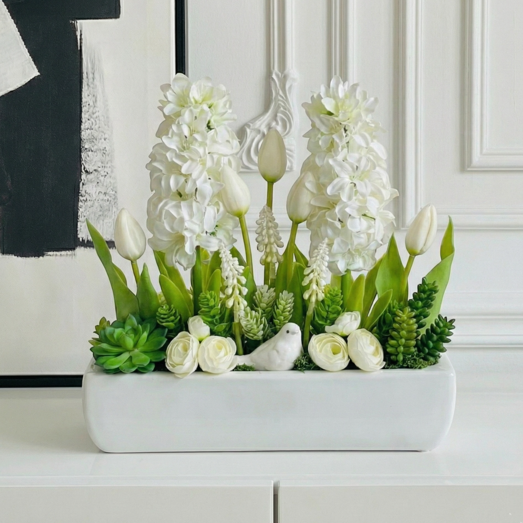 Elegancka kompozycja kwiatowa w ceramicznej donicy to stylowa dekoracja, która doskonale uzupełni każde wnętrze. Głównym elementem aranżacji są hiacynty oraz tulipany, rozmieszczone na różnych wysokościach, co nadaje całości lekkości i przestrzenności.