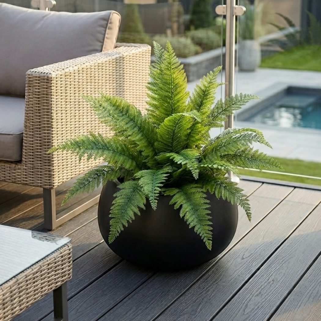 Stylowa i naturalnie wyglądająca kompozycja z paproci, która doskonale odwzorowuje strukturę i lekkość prawdziwej rośliny. Gęste, rozłożyste liście w odcieniach zieleni tworzą efekt świeżości i elegancji. Całość została umieszczona w nowoczesnej donicy w kolorze antracytowym, dzięki czemu idealnie pasuje zarówno do wnętrz, jak i przestrzeni zewnętrznych tarasu czy balkonu.