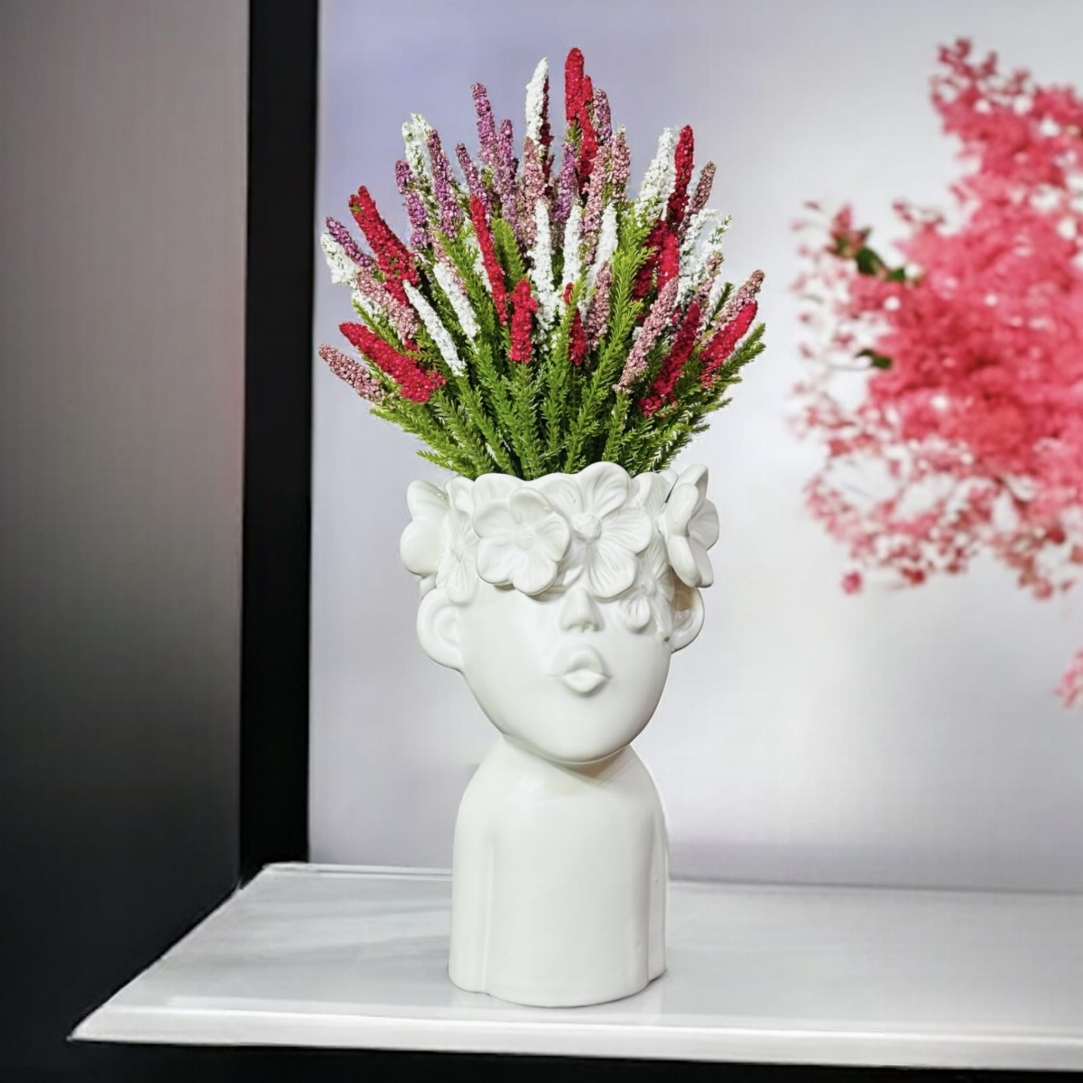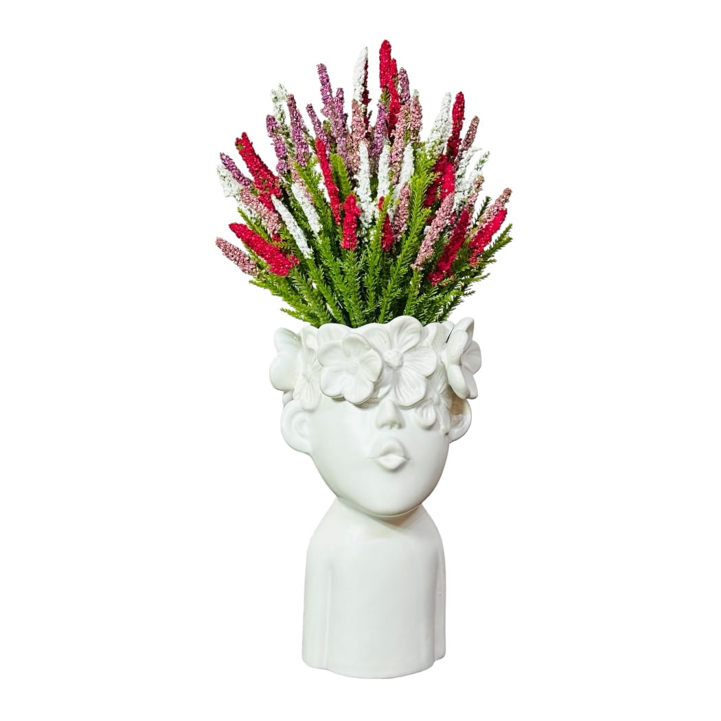 Ta wyjątkowa kompozycja kwiatowa to połączenie naturalnego piękna i nowoczesnego designu. Delikatne, różowo-białe wrzosy umieszczone zostały w oryginalnej, ceramicznej doniczce w kształcie ludzkiej głowy. Doniczka wykonana jest z wysokiej jakości materiałów i charakteryzuje się gładką, matową powierzchnią. Jej minimalistyczny design i subtelne kolory sprawiają, że będzie pasować do wielu wnętrz, dodając im przytulności i oryginalności.