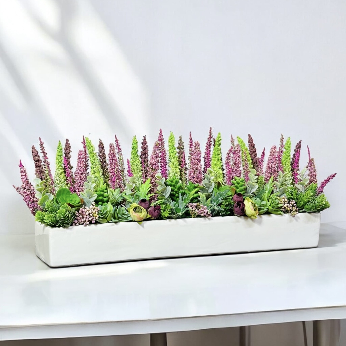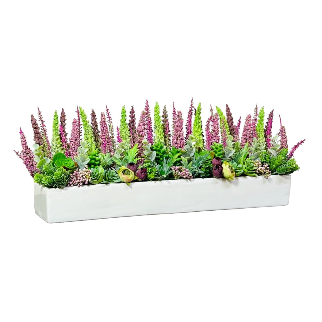 Kompozycja z wrzosów w podłużnej białej rynnie