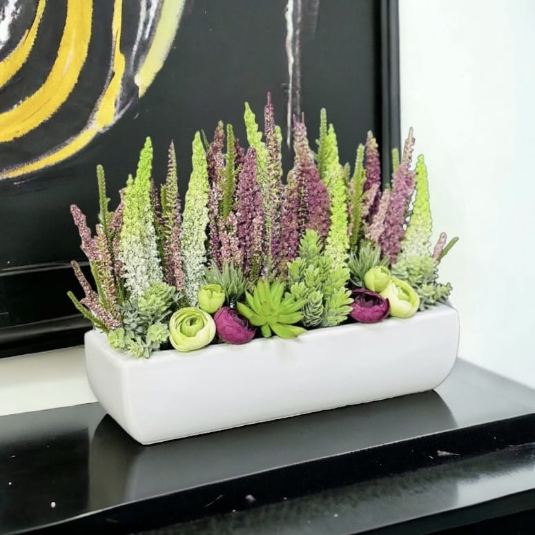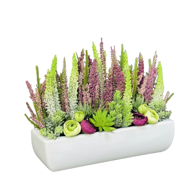 Nasza wyjątkowa kompozycja z wrzosów to idealny dodatek do każdego wnętrza. Umieszczona w eleganckiej, podłużnej ceramicznej doniczce, utrzymanej odcieniach amarantu, zieleni oraz różu, zachwyca swoją subtelnością i harmonią kolorów. W tej starannie dobranej aranżacji, oprócz pięknych wrzosów, znajdziemy także zielone dodatki w postaci sukulentów oraz jaskrów, które dodają całości świeżości i naturalnego uroku.