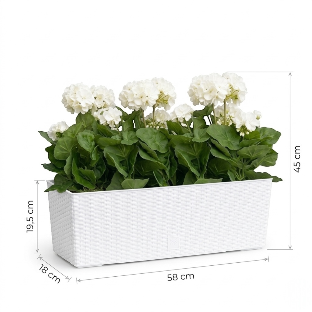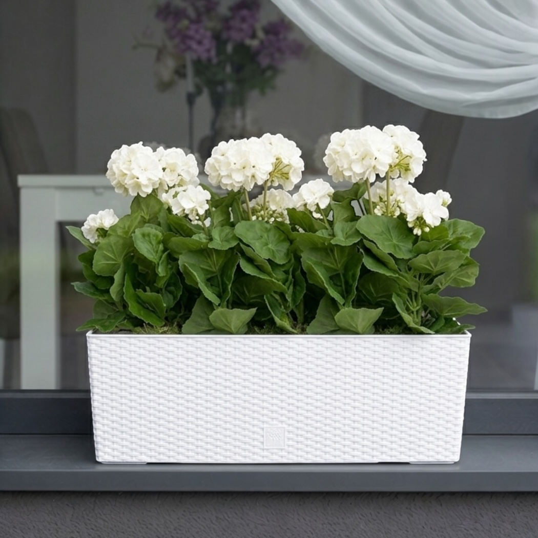 Elegancka kompozycja z białej pelargonii osadzona w prostokątnej donicy o strukturze plecionki to ponadczasowa dekoracja, która wprowadza świeżość i harmonię do każdej przestrzeni. Jasne kwiaty w połączeniu z intensywną zielenią liści tworzą naturalny, lekki efekt idealny do nowoczesnych i klasycznych aranżacji. Dzięki wydłużonej formie donicy kompozycja świetnie sprawdzi się na parapecie, balkonie lub jako dekoracja stołu czy balustrady.
