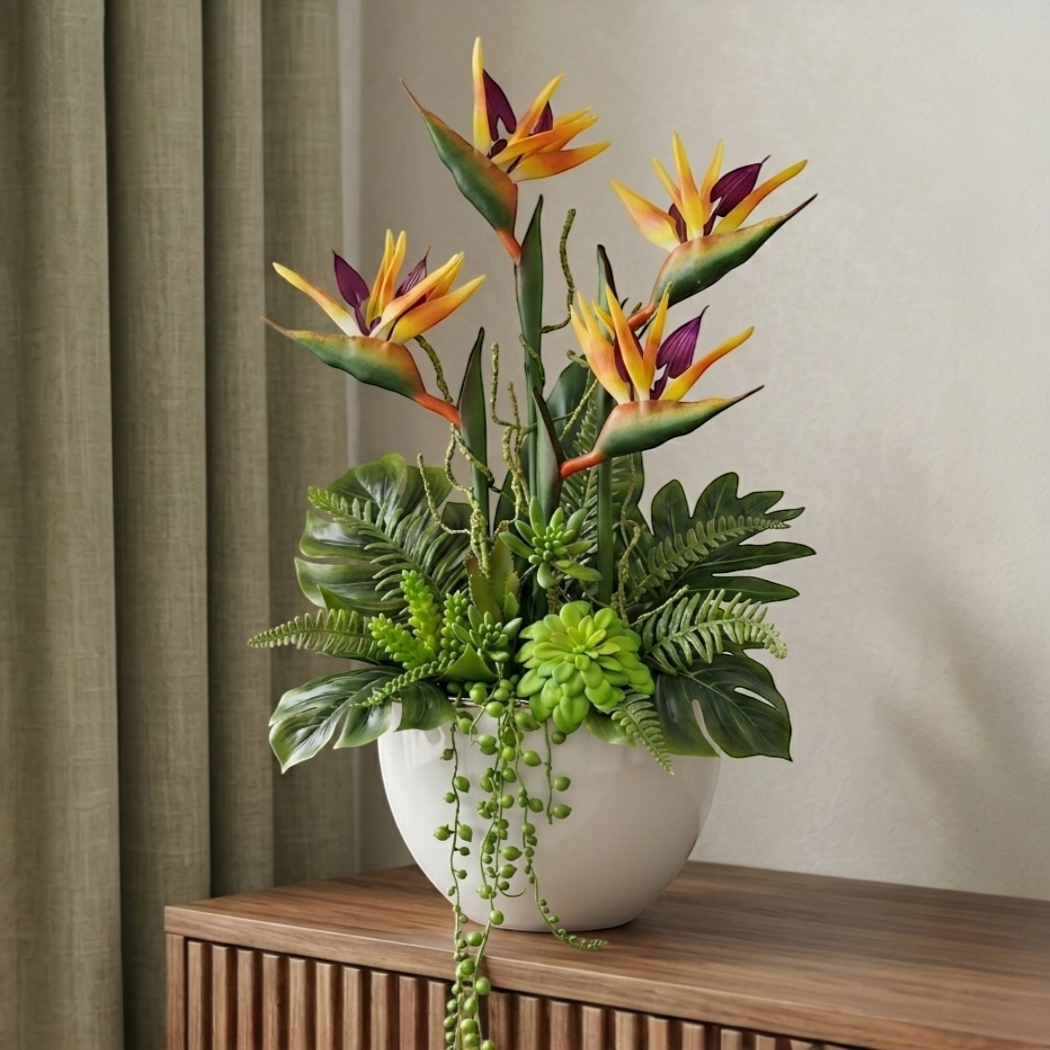 Efektowna kompozycja z egzotyczną strelicją królewską w intensywnych odcieniach żółci, pomarańczy i fioletu. Charakterystyczne kwiaty w połączeniu z bujną zielenią liści oraz realistycznymi sukulentami tworzą nowoczesną i elegancką dekorację do wnętrza.