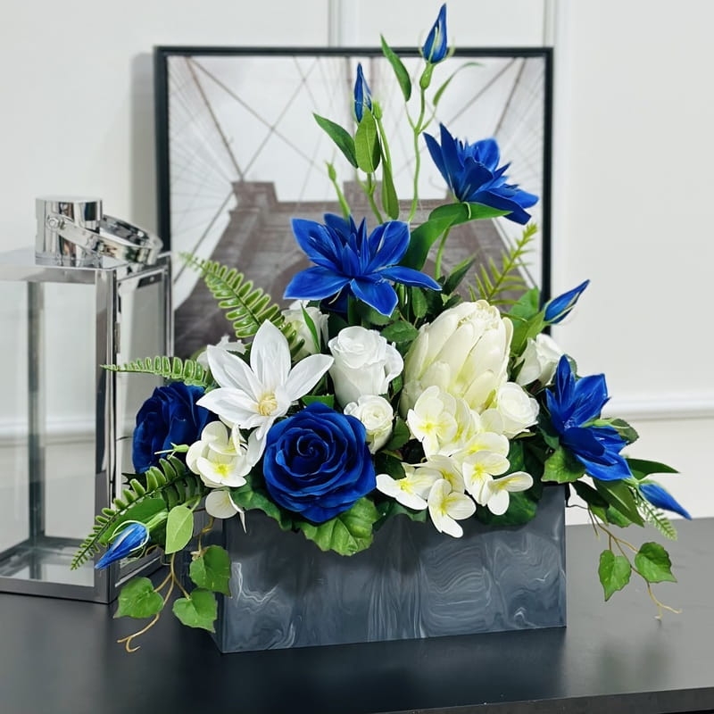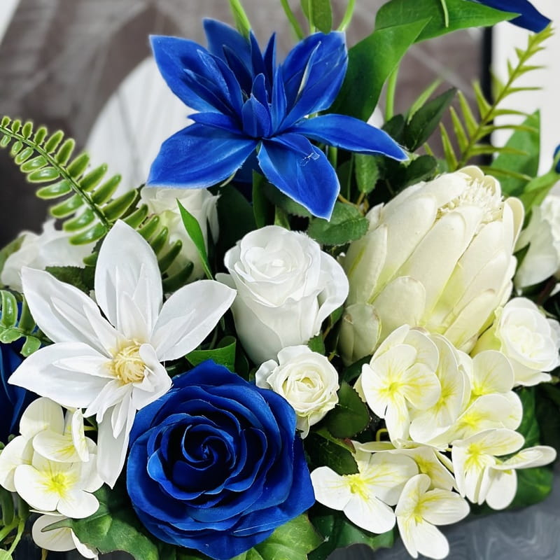 Stroik na cmentarz w doniczce w kształcie rynny, obciążonej masą betonową, co zapewnia stabilność na pomniku. Kompozycja została wykonana z wysokiej jakości dekoracyjnych sztucznych kwiatów – róż, dalii, klematisów oraz zielonych dodatków. Dzięki trwałym materiałom stroik jest odporny na warunki atmosferyczne i zachowuje elegancki wygląd przez długi czas. To piękna i godna forma upamiętnienia bliskiej osoby.