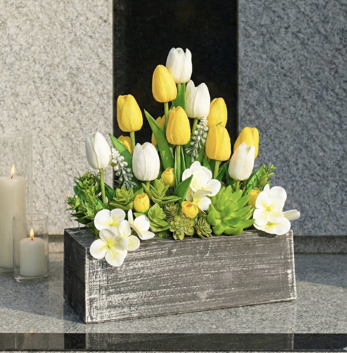 Elegancka kompozycja nagrobna wykonana z wysokiej jakości sztucznych kwiatów w odcieniach żółci i bieli. Połączenie tulipanów z delikatnymi dodatkami kwiatowymi oraz sukulentami tworzy harmonijną, estetyczną całość, która pięknie prezentuje się na pomniku i nie wymaga pielęgnacji.