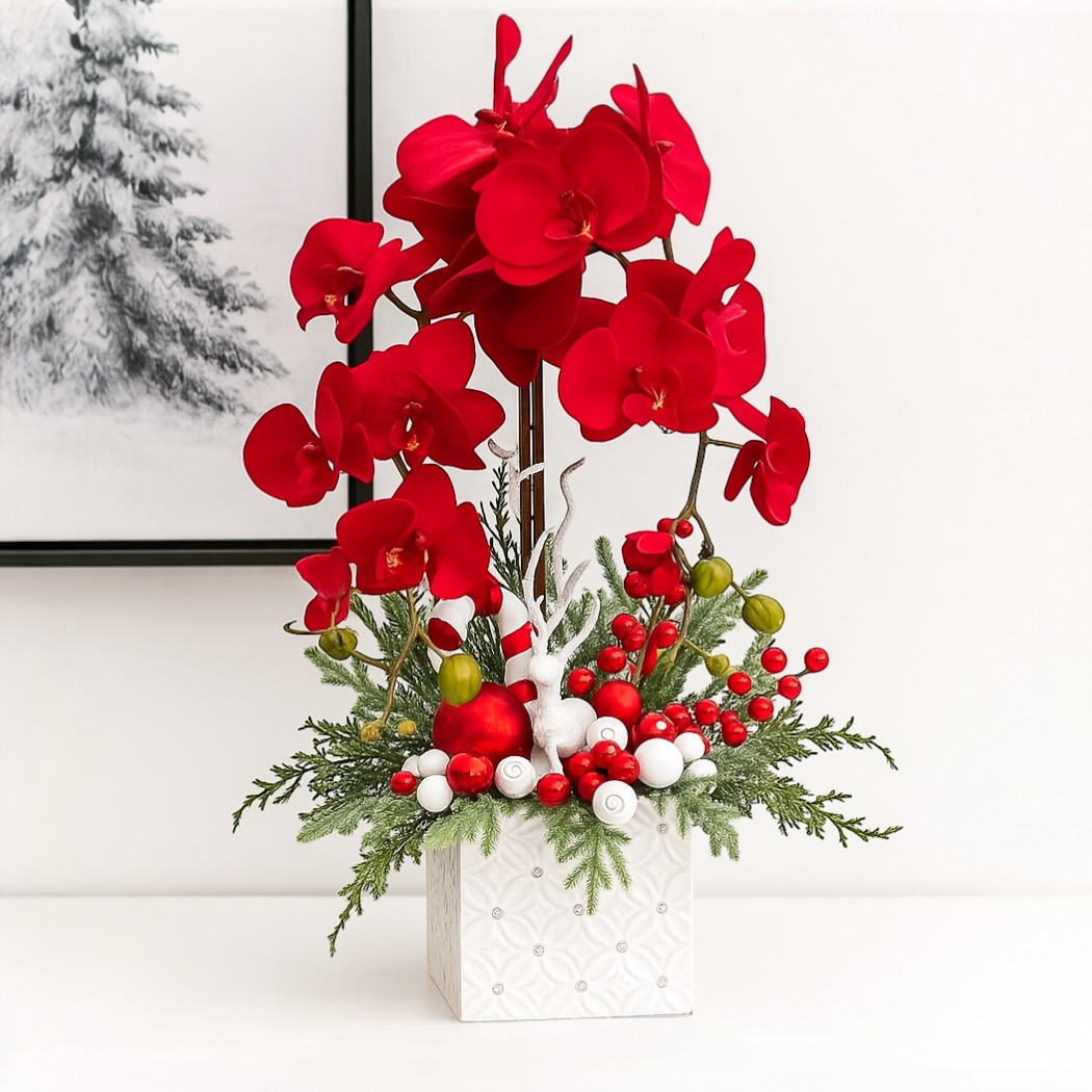 Kompozycję wzbogacają zielone gałązki, złote akcenty, świąteczne ozdoby oraz dekoracyjna figura białego renifera, co nadaje całości wyjątkowego, bożonarodzeniowego charakteru. Stroik umieszczony jest w eleganckiej, zdobionej donicy, która dodaje mu szyku i blasku. Całość spoczywa na lustrzanej podstawie ozdobionej kryształowymi elementami, co podkreśla luksusowy wygląd dekoracji.
