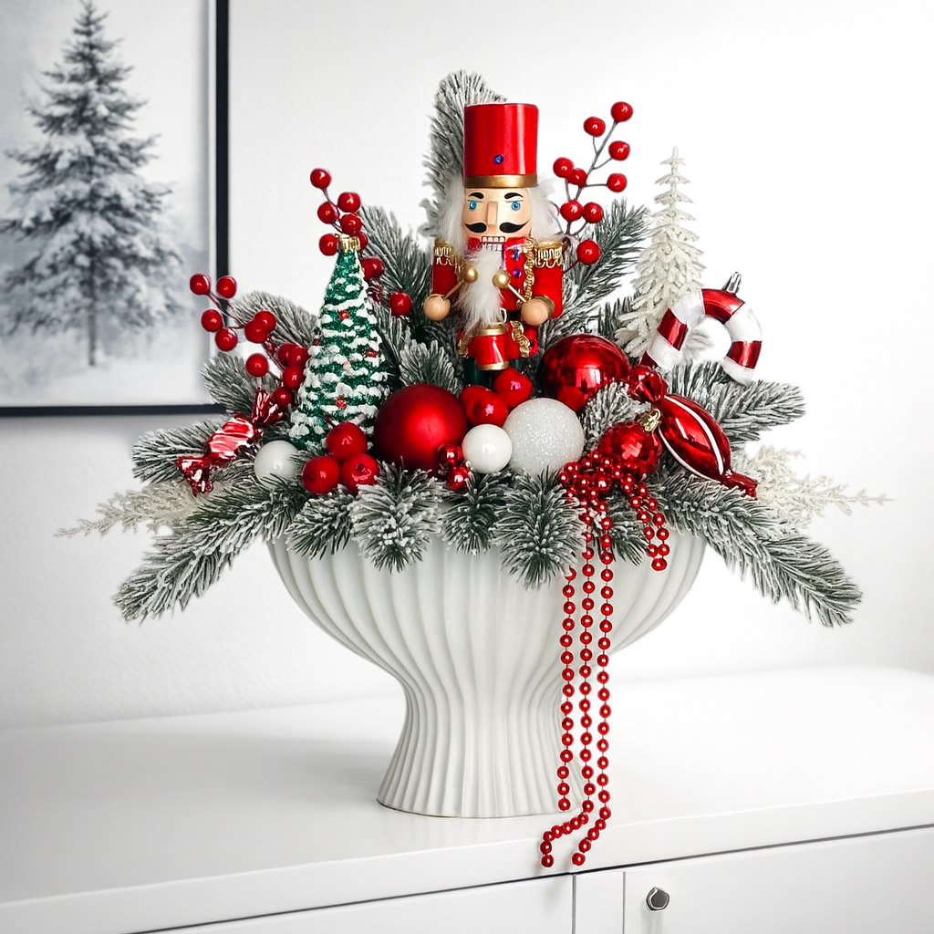 Ten wyjątkowy stroik to połączenie klasyki świąt i eleganckiego wykończenia. Centralnym elementem aranżacji jest kultowy Dziadek do Orzechów w intensywnie czerwonym kolorze, który od razu wprowadza do wnętrza magiczny, świąteczny klimat.