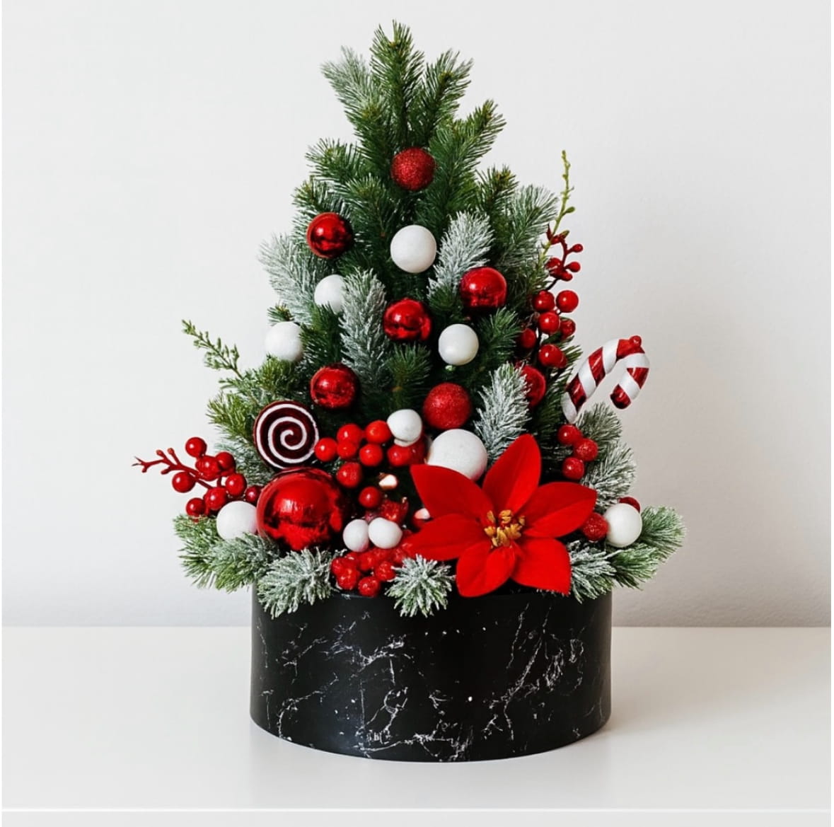 Elegancki stroik nagrobny w świątecznej aranżacji, wykonany z najwyższej jakości sztucznych kwiatów i dekoracji. Kompozycja umieszczona w czarnej, marmurowej misie zawiera czerwone róże i gwiazdy betlejemskie, ozdobne złote bombki i aniołka, oraz zimowe akcenty w postaci ośnieżonych gałązek świerkowych i czerwonych jagód. Całość uzupełniają delikatne białe elementy przypominające śnieg oraz złote koraliki, nadające kompozycji świątecznego blasku. Stroik jest odporny na warunki atmosferyczne i idealnie sprawdzi się jako trwała, świąteczna dekoracja nagrobna, pozwalająca w godny sposób upamiętnić bliskich w okresie Bożego Narodzenia.
