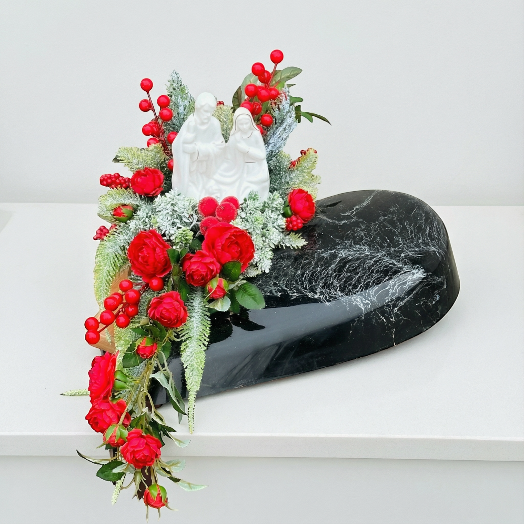 Wyjątkowy, elegancki stroik nagrobny wykonany w doniczce w kształcie serca, która imituje czarny marmur z delikatnymi smugami. To dekoracja premium, która podkreśla powagę miejsca pamięci, jednocześnie wprowadzając piękny, świąteczny akcent.