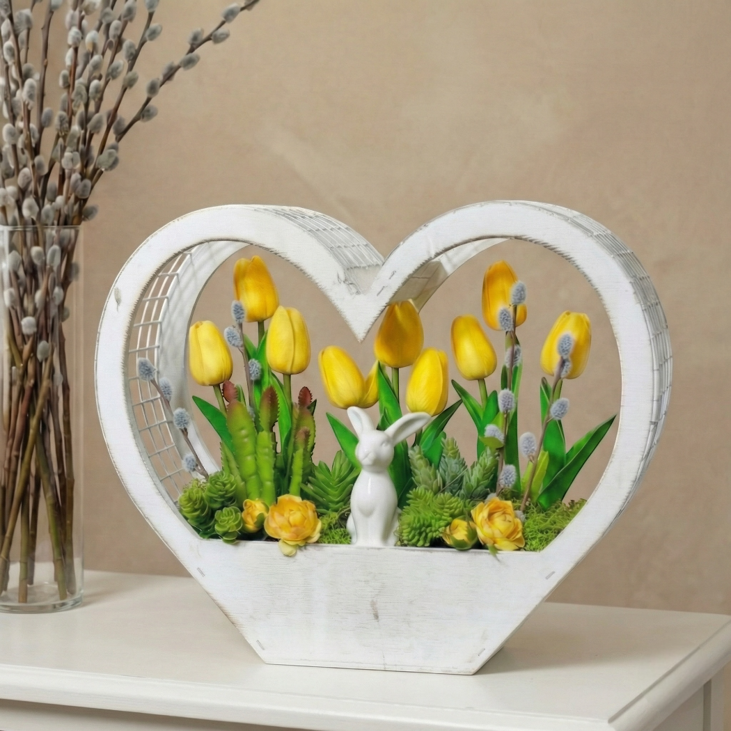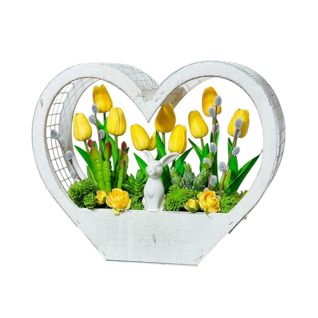 Wiosenna kompozycja w formie stroika na cmentarz, osadzona w drewnianej doniczce w kształcie serca o jasnym, delikatnie postarzanym wykończeniu. Delikatny kształt podkreśla charakter dekoracji, a całość wygląda spójnie i estetycznie.