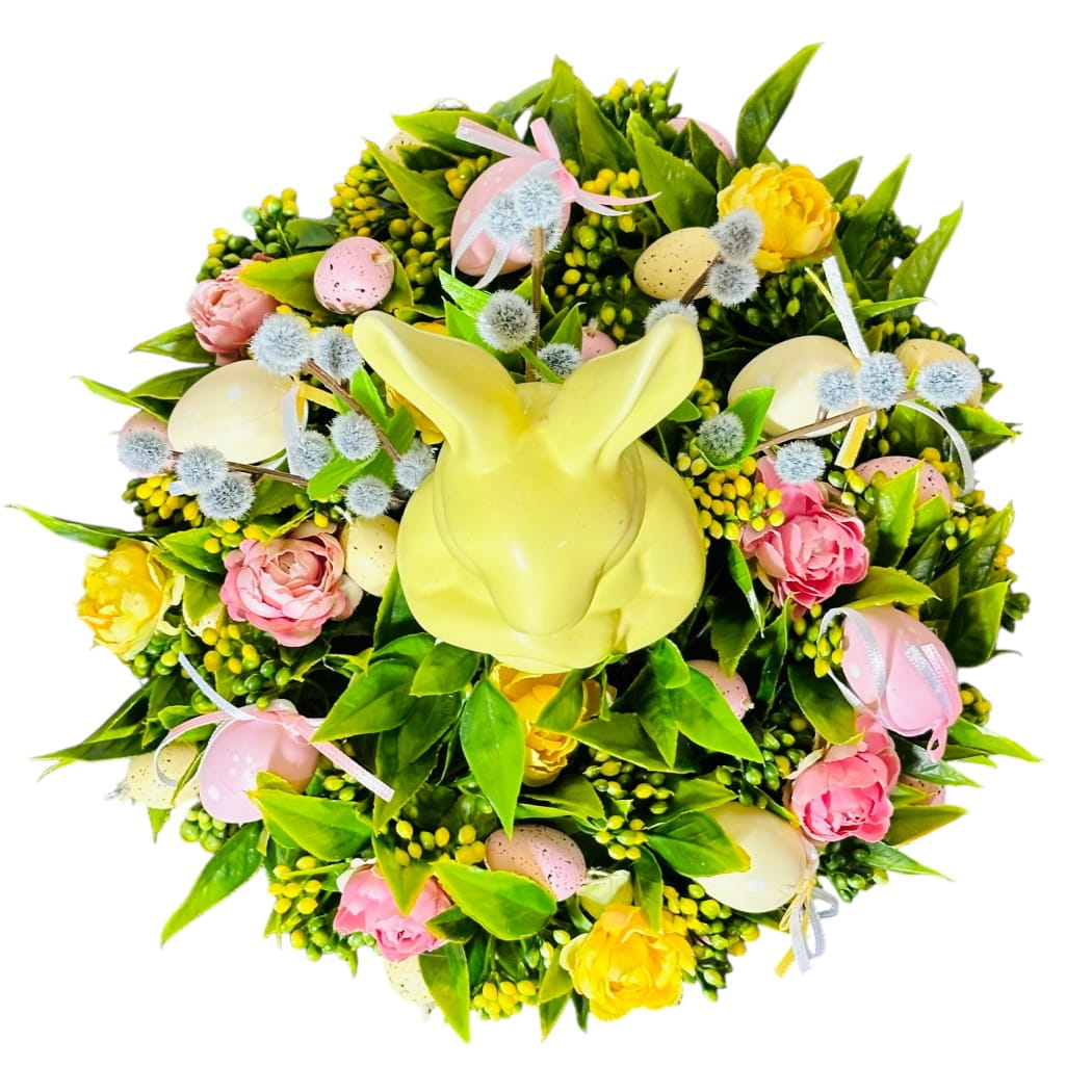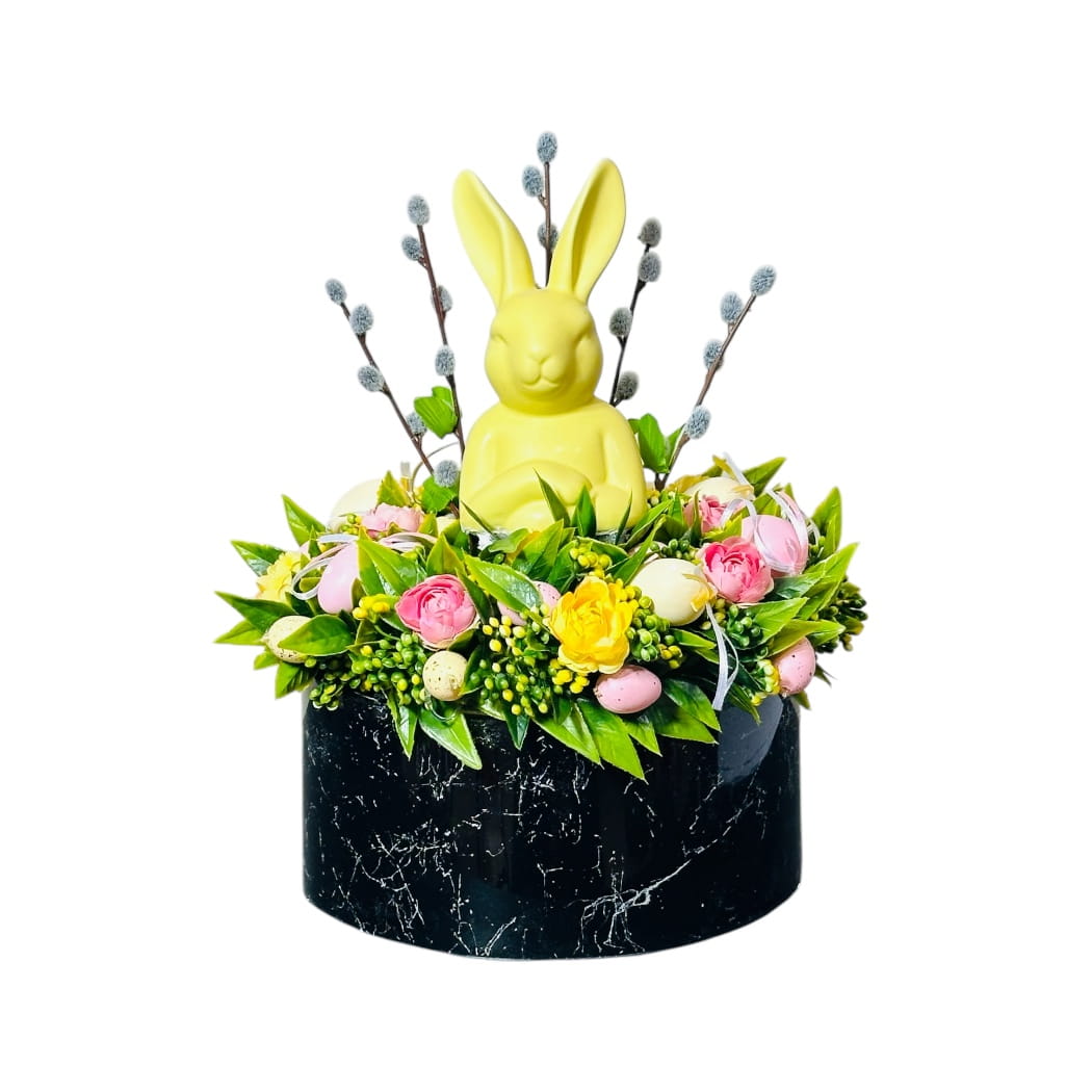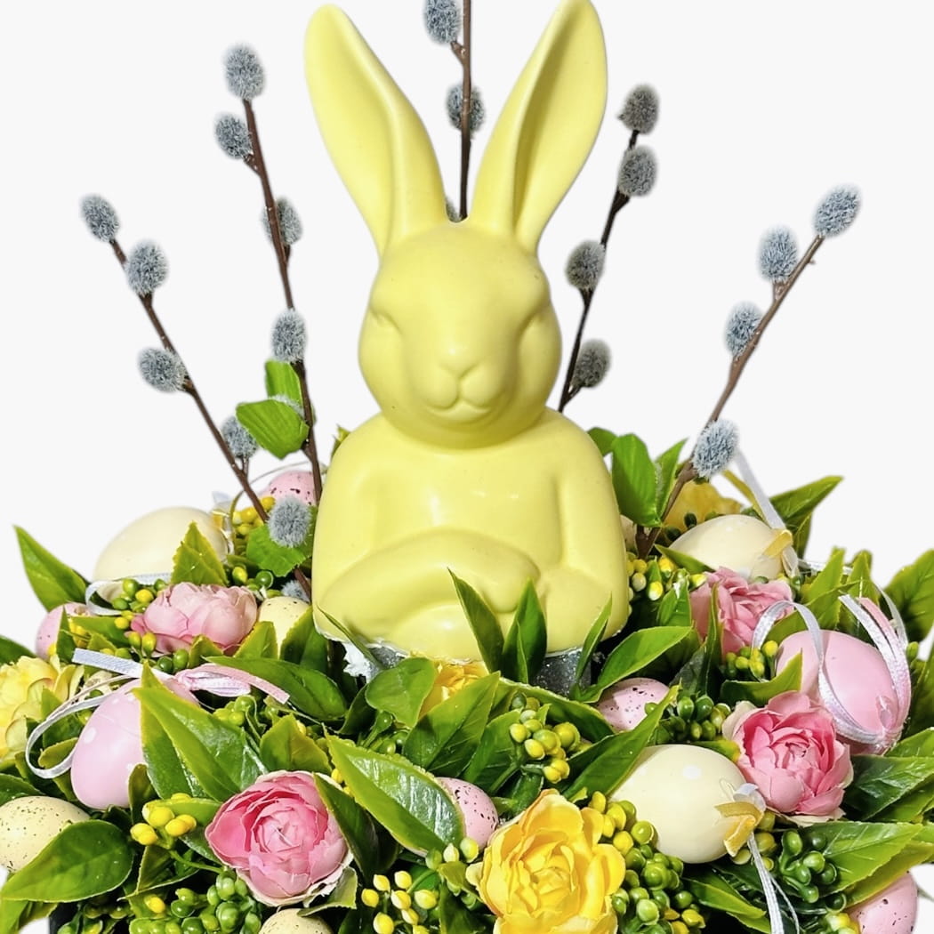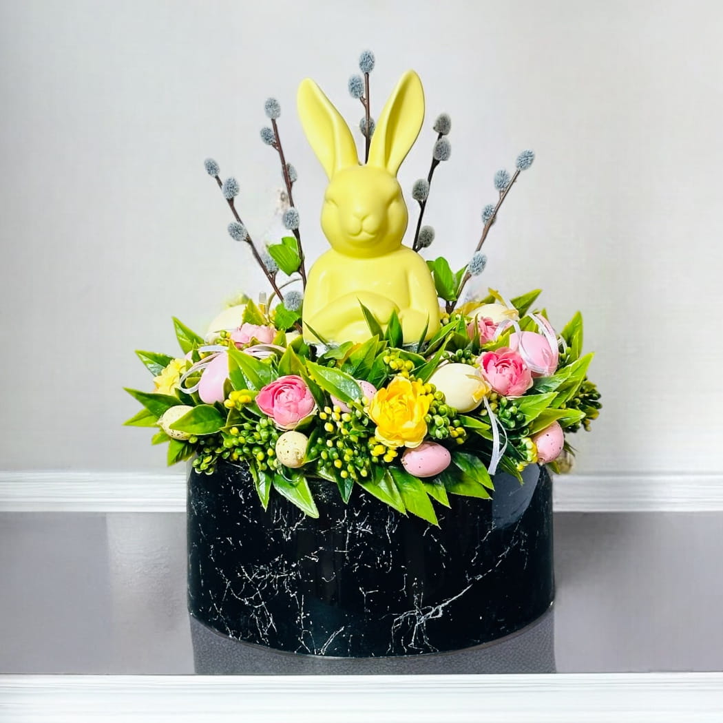 Stroik wielkanocny na cmentarz to elegancka i symboliczna dekoracja nagrobna, która wprowadza wiosenny nastrój i podkreśla wyjątkowy charakter Świąt Wielkanocnych. Kompozycja składa się z żółtych kwiatów symbolizujących nadzieję i odrodzenie, uzupełnionych zielonymi dodatkami oraz delikatnymi różowymi akcentami, które nadają całości harmonii i lekkości. Całość zdobi bazie, wprowadzając subtelny, naturalny element wiosny. Centralnym punktem dekoracji jest żółty zajączek, który dodaje stroikowi świątecznego charakteru i wyjątkowego uroku. Kompozycja osadzona jest w solidnej, eleganckiej czarnej osłonce, zapewniającej stabilność i trwałość. Stroik został wykonany z wysokiej jakości materiałów odpornych na warunki atmosferyczne, co sprawia, że przez długi czas zachowa swój piękny wygląd. To wyjątkowa dekoracja, która stanie się pięknym symbolem pamięci o bliskich w czasie Wielkanocy.
