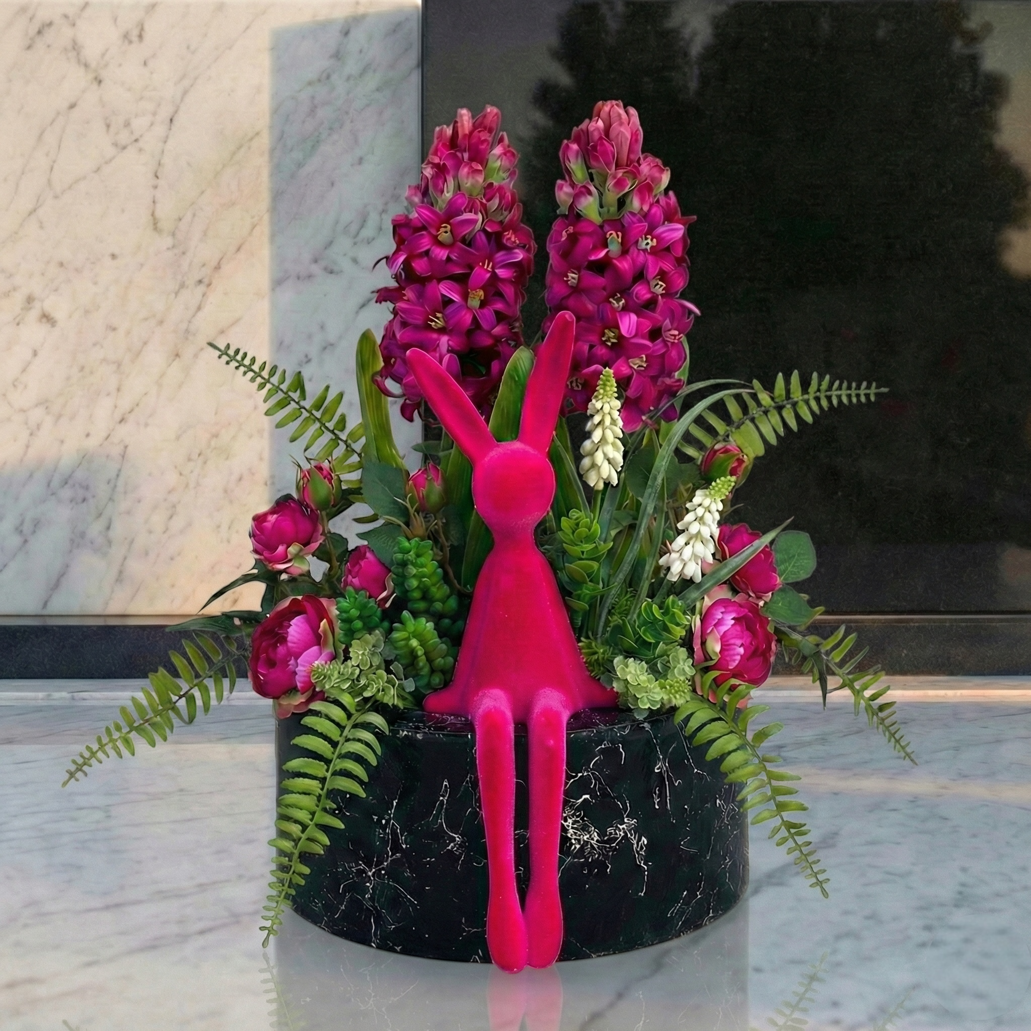 Nowoczesna i wyrazista kompozycja wielkanocna, która przyciąga uwagę intensywną kolorystyką oraz oryginalną formą. Centralnym elementem dekoracji jest stylizowany zajączek w mocnym fuksjowym kolorze, osadzony w eleganckiej, czarnej donicy o marmurkowym wykończeniu. Całość uzupełniają dekoracyjne kwiaty i zieleń, tworząc spójną i efektowną aranżację idealną na Wielkanoc.