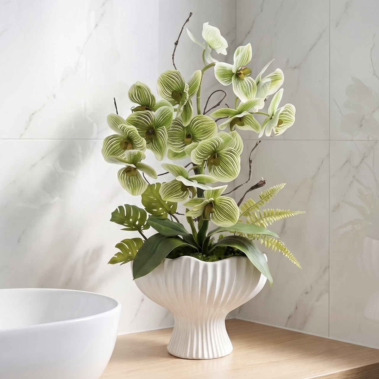 Efektowna, elegancka kompozycja z zielonego storczyka, która przyciąga uwagę swoim naturalnym wyglądem i subtelną kolorystyką. Delikatnie cieniowane kwiaty w odcieniach zieleni zostały połączone z dekoracyjnymi liśćmi i dodatkami roślinnymi, tworząc harmonijną i stylową całość. Idealna dekoracja do nowoczesnych wnętrz łazienki, salonu czy biura.
