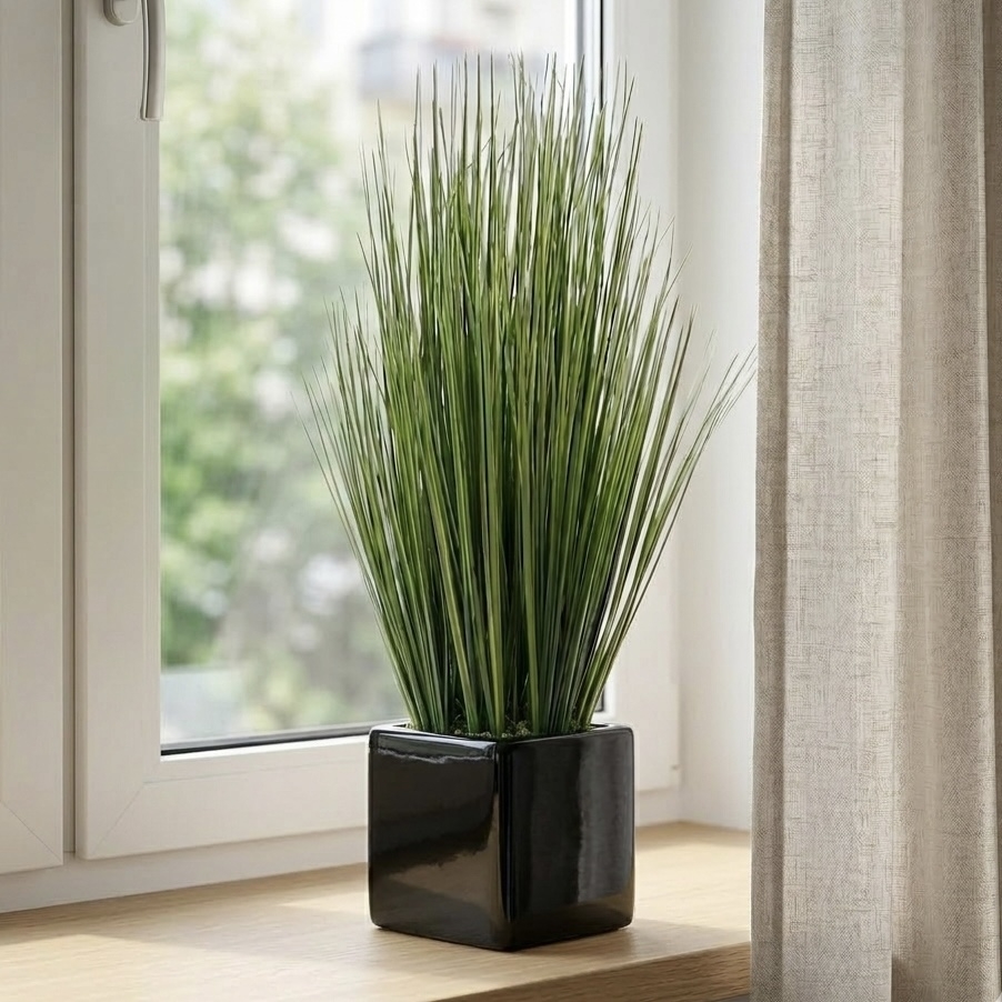 Roślina została umieszczona w eleganckiej doniczce o połyskującym wykończeniu i prostej formie. Kontrast między zielenią trawy, a głęboką czernią donicy nadaje całości nowoczesnego i ponadczasowego charakteru.