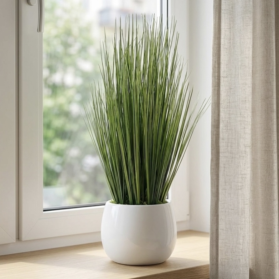 Nowoczesna i minimalistyczna dekoracja w postaci gęstej trawy ozdobnej, która doskonale wpisuje się w każde wnętrze. Smukłe, zielone źdźbła nadają lekkości i świeżości, tworząc elegancki, naturalny akcent bez konieczności pielęgnacji.