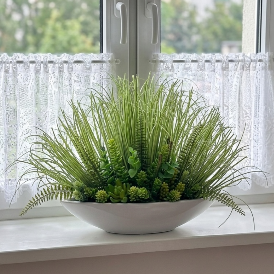 Nowoczesna i minimalistyczna dekoracja w postaci gęstej trawy ozdobnej, która doskonale wpisuje się w każde wnętrze. Smukłe, zielone źdźbła nadają lekkości i świeżości, tworząc elegancki, naturalny akcent bez konieczności pielęgnacji.