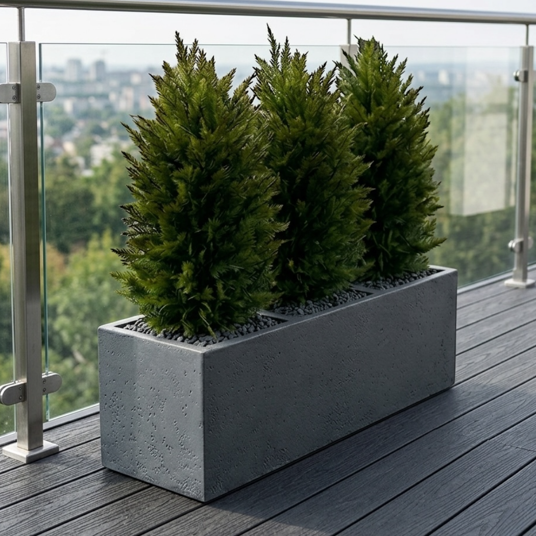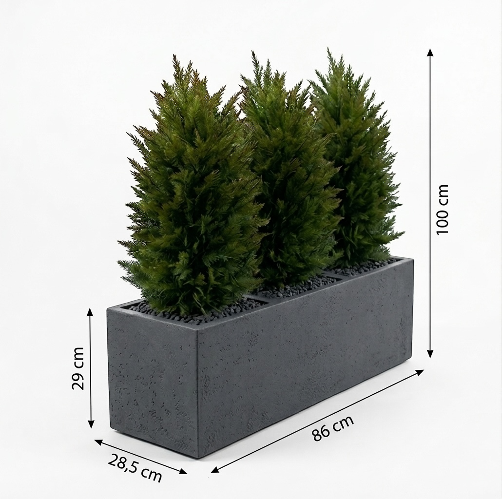 Stylowa kompozycja składająca się z trzech gęstych, realistycznie odwzorowanych tui osadzonych w nowoczesnej, podłużnej donicy. Dzięki swojej formie i proporcjom idealnie sprawdzi się jako dekoracja na tarasie, balkonie lub przy wejściu do domu, wprowadzając zielony akcent bez konieczności pielęgnacji.