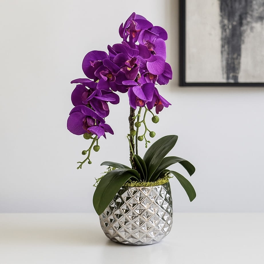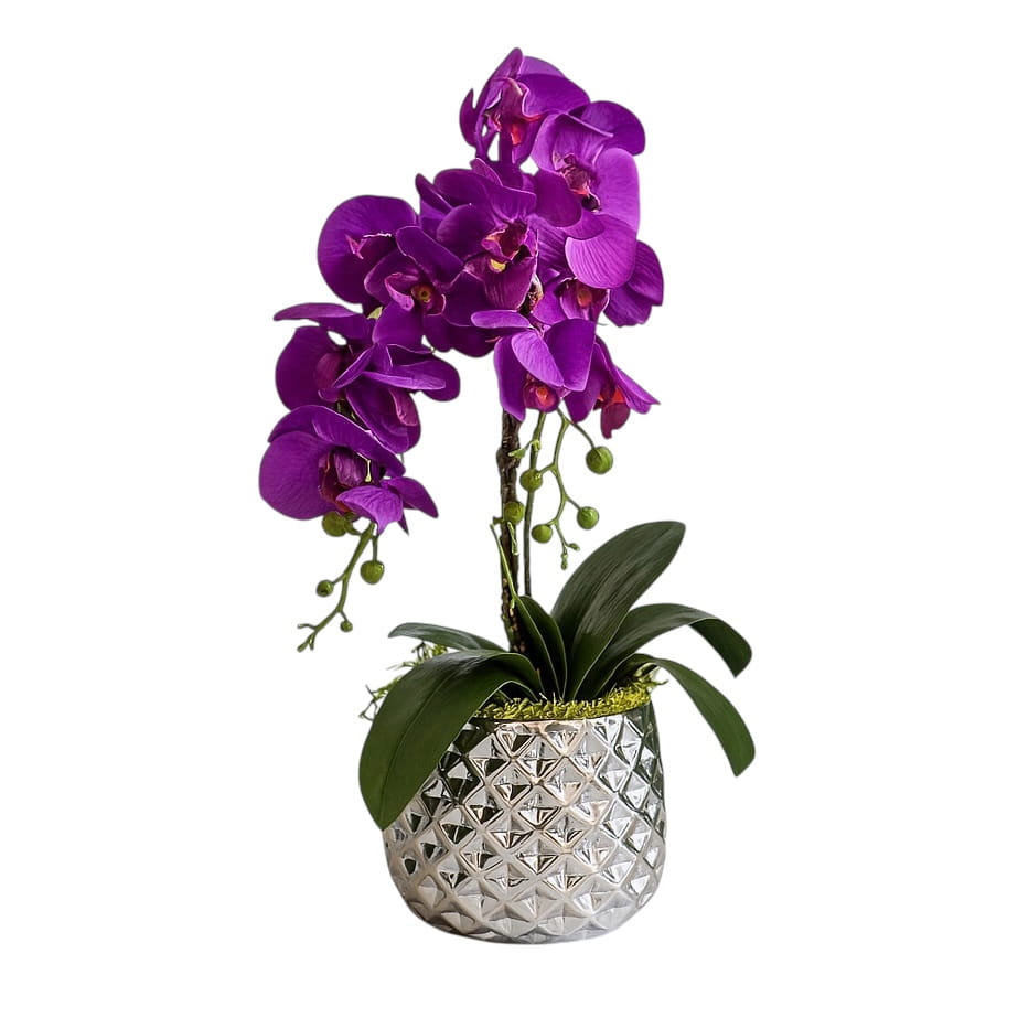 Zapraszamy do odkrycia wyjątkowej kompozycji - nasz sztuczny storczyk w intensywnym odcieniu fioletu. Ten gumowy storczyk to kwintesencja piękna i trwałości. Umieszczony w ceramicznej doniczce o srebrnym kolorze, tworzy harmonijną całość, którą uzupełniają zielony mech chrobotek, list storczyka oraz dekoracyjny zielony korzeń.