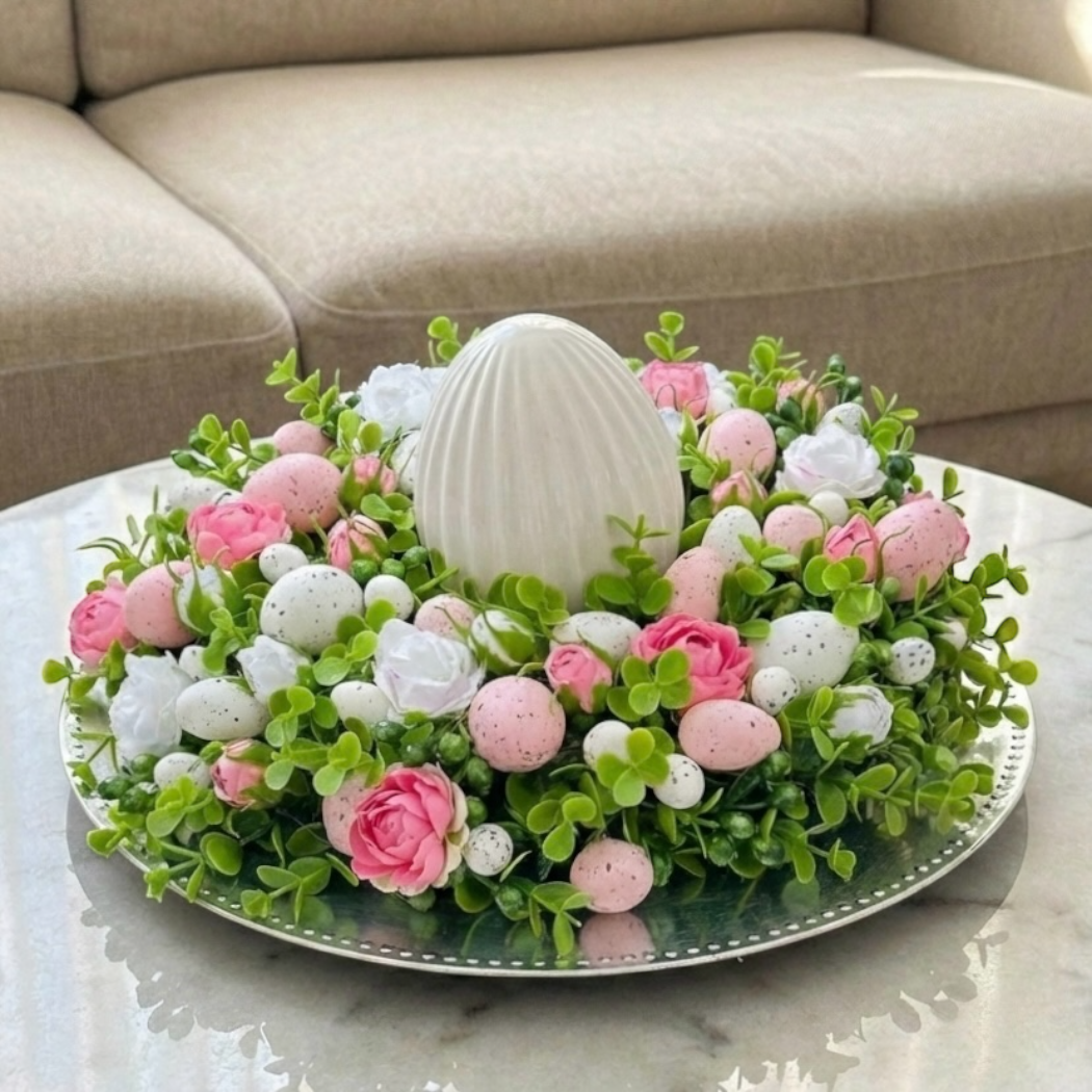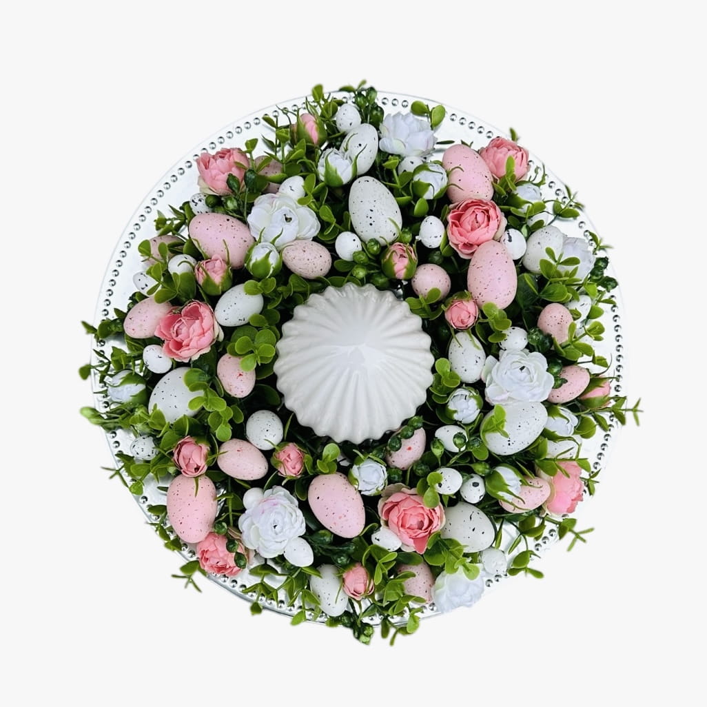 Wianek wielkanocny utrzymany w harmonijnej, różowo-białejkolorystyce. Wykonany z wysokiej jakości sztucznych gałązek, delikatnych kwiatów oraz nakrapianych jajek, tworzy wyjątkową i subtelną kompozycję. Centralnym elementem ozdoby jest efektowne, jajko, które nadaje całości eleganckiego charakteru. Wianek doskonale sprawdzi się jako dekoracja stołu, komody lub drzwi wejściowych, wprowadzając do wnętrza świeżość, spokój i świąteczną atmosferę.