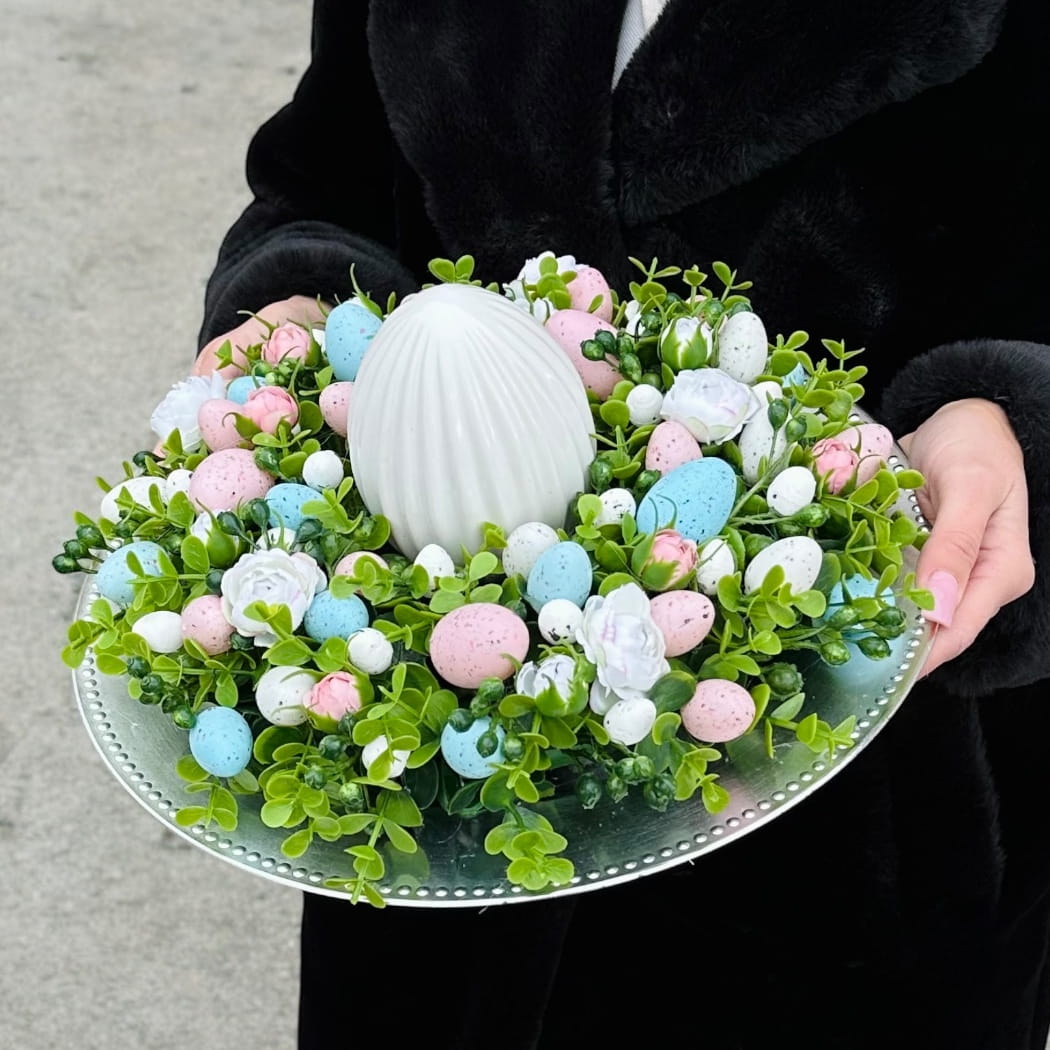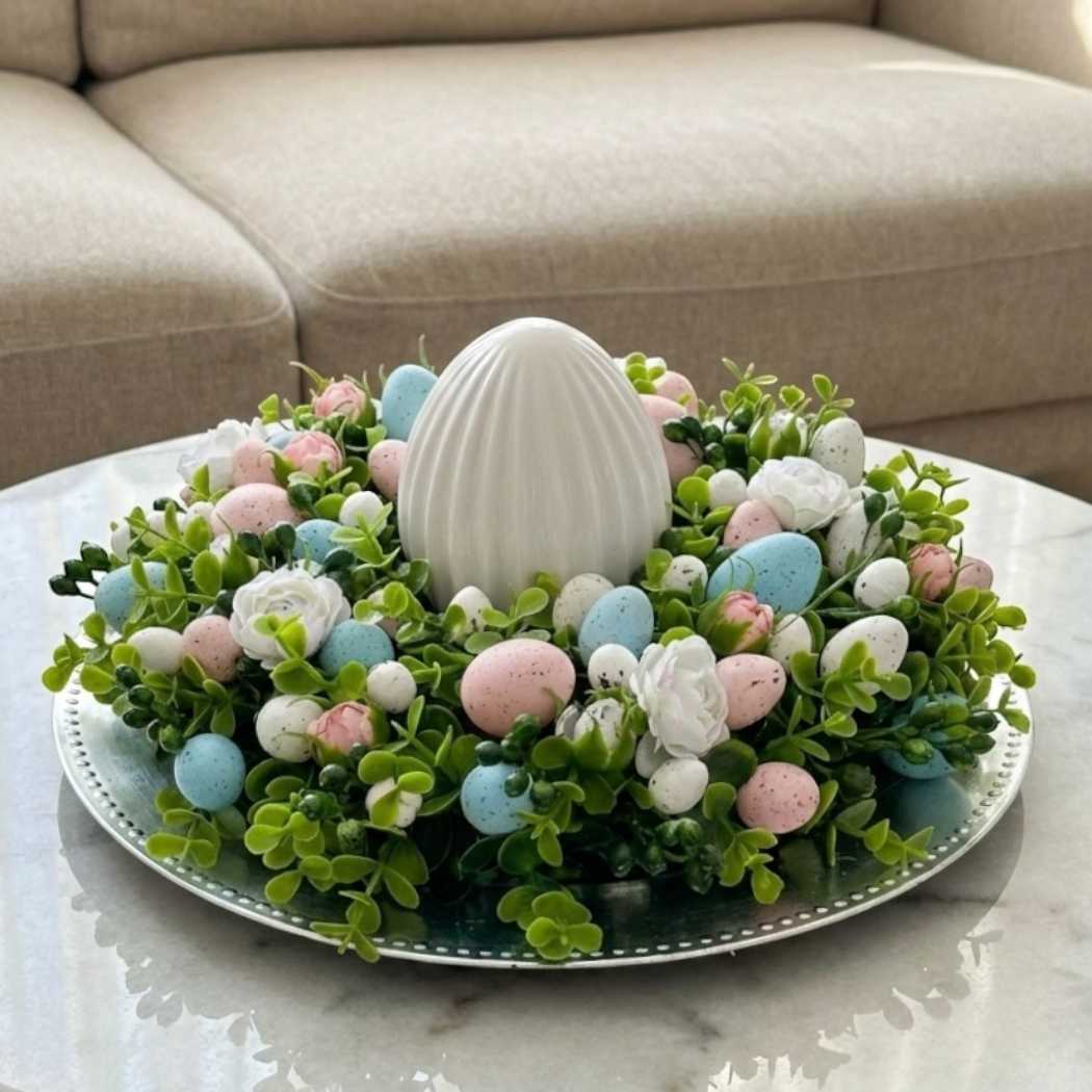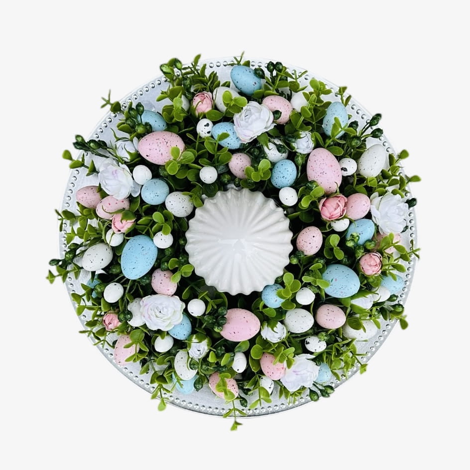 Wianek wielkanocny wykonany z wysokiej jakości sztucznych gałązek, pastelowych kwiatów oraz barwnych pisanek w różnych rozmiarach. Ozdobiony nakrapianymi jajkami w odcieniach różu, żółci i bieli, a także zielonymi listkami, symbolizuje wiosenną świeżość i odrodzenie. Centralnym elementem kompozycji jest ceramiczna ozdoba w kształcie jajka, która dodaje dekoracji wyjątkowego charakteru. Wianek doskonale sprawdzi się jako element wystroju stołu, komody czy drzwi wejściowych, wprowadzając do wnętrza radosny, wielkanocny nastrój.