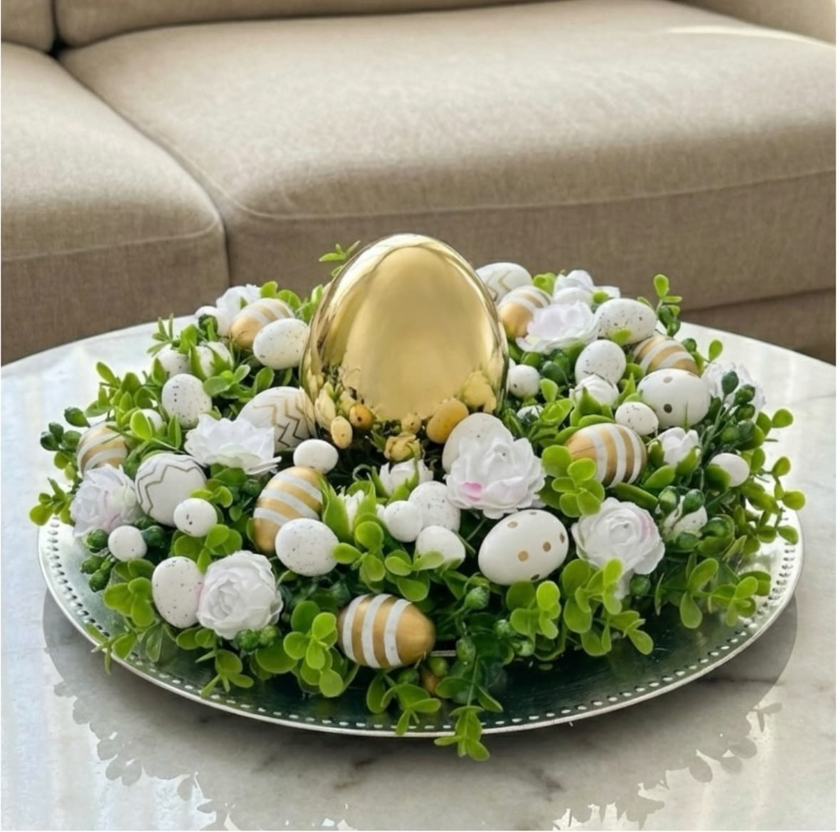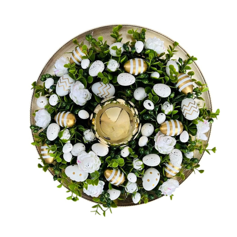 Wianek wielkanocny utrzymany w harmonijnej, biało-złotej kolorystyce. Wykonany z wysokiej jakości sztucznych gałązek, delikatnych białych kwiatów oraz nakrapianych jajek, tworzy wyjątkową i subtelną kompozycję. Centralnym elementem ozdoby jest efektowne, złote jajko, które nadaje całości eleganckiego charakteru. Wianek doskonale sprawdzi się jako dekoracja stołu, komody wprowadzając do wnętrza świeżość, spokój i świąteczną atmosferę.